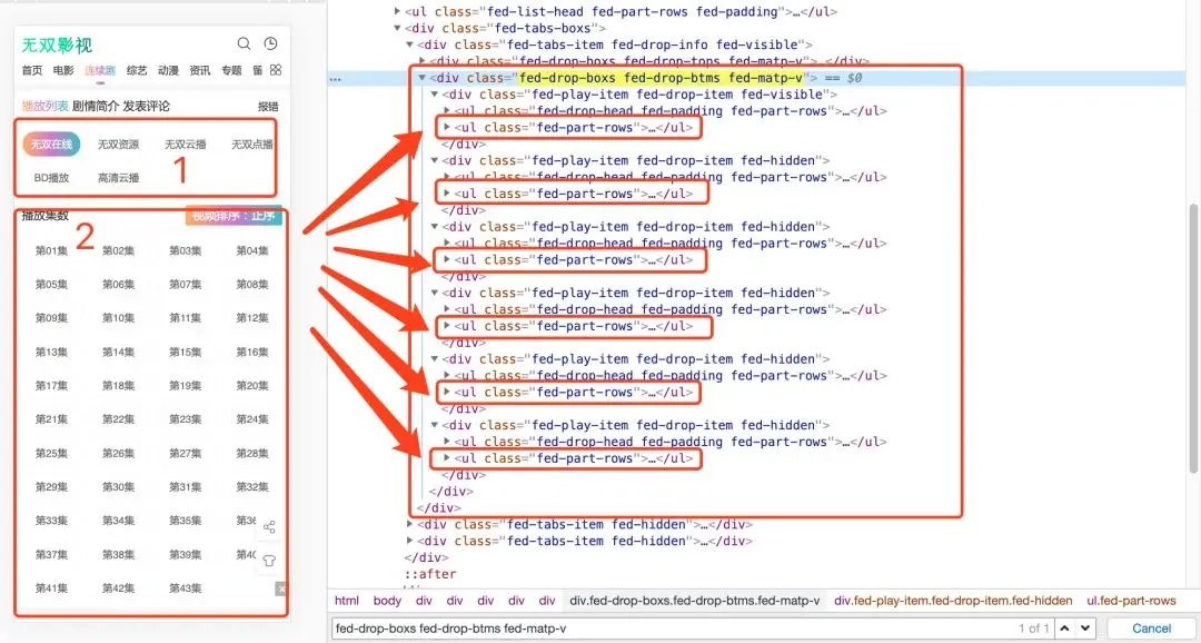 剧集详情页播放线路列表规则:class.fed-drop-boxs fed-drop-btms fed-matp-v.0@class.fed-part-rows(说明:这个规则控制找出各个线路列表。这里看图中1处共有六个线路,分别点击各个线路则2处会显示对应线路的集列表,显示的各个线路的集列表就是对应右面的六处红框代码显示)