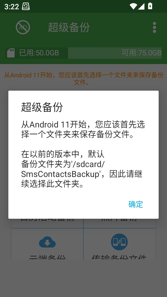 1、安装超级备份后打开软件,安卓11及以上版本会提示需选择特定文件夹方可进行备份;