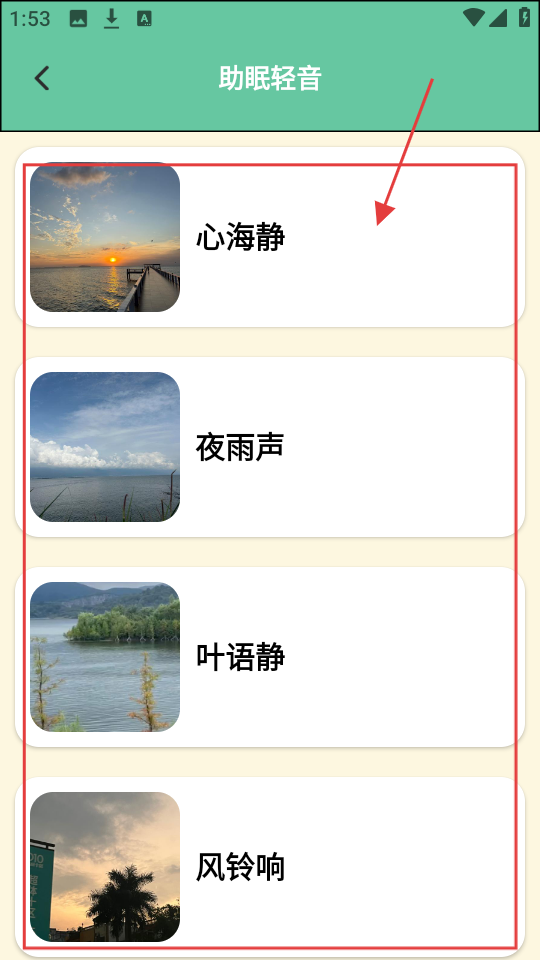 2、助眠轻音列表包含【心海静】【夜雨声】等选项,您可以挑选自己喜欢的,例如【夜雨声】,点击进入即可聆听。