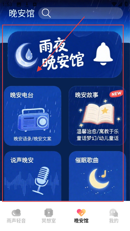4、晚安馆页面设有【晚安电台】【晚安故事】等板块,你可以挑选自己感兴趣的内容,比如点击【晚安电台】收听节目,这样能更有效地帮助你解压放松呢。
