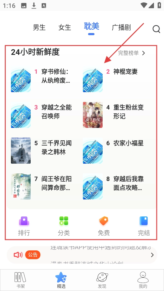 1、进入精选页面后选择【耽美】分类,从中找到你感兴趣的小说(例如《神棍宠妻》),点击进入即可查看详情。