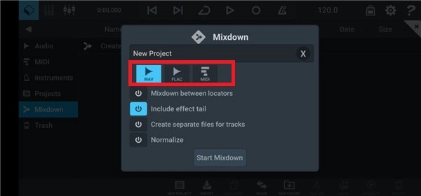3、接着点击左上角,选择mixdown里最顶部的create mixdown选项
