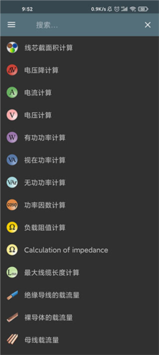 1、安装本站提供的电工计算器软件,进入软件之后我们可以看到主页有很多功能;