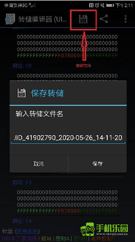 3、此时,卡片信息已成功读取,可点击右上角按钮将信息保存至本地。若读取过程中因卡片接触不良,致使部分扇区信息未被读取,可通过再次读取解决该问题。已存储的文件可通过主界面的“编辑/分析转储文件”功能打开。