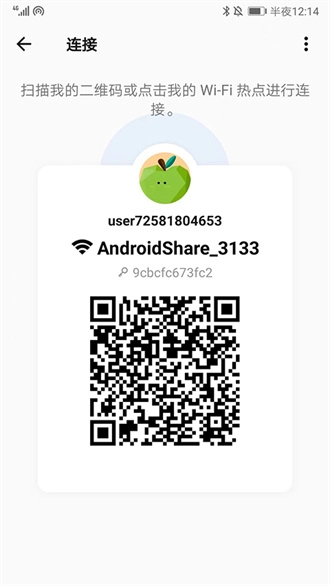 2、如图所示,二维码已生成,发送方可以通过扫描接收方的二维码,或者点击WiFi热点的方式来建立连接。