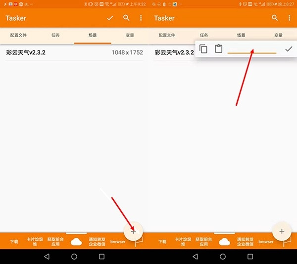 在Tasker主界面点击场景选项卡,切换至场景查看与制作界面,接着点击右下角的“+”按钮新建场景,完成场景名称设定后会自动进入场景设计界面。