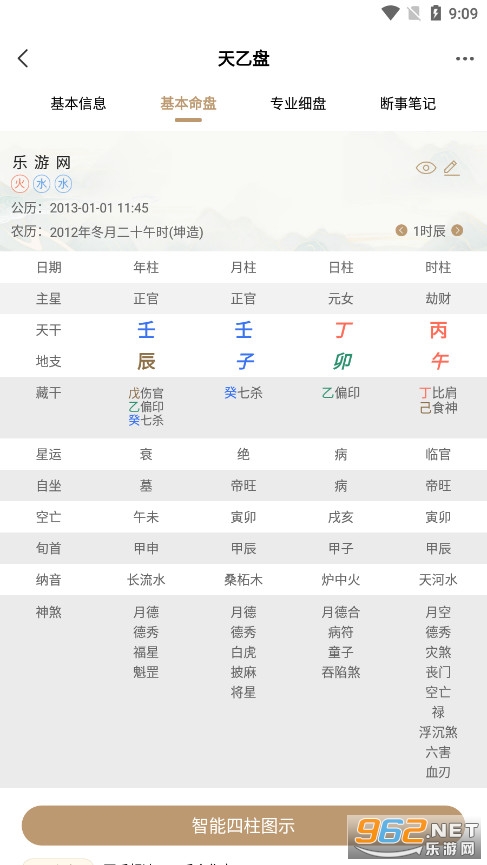 在【基本命盘】板块,呈现的是二十八星宿所对应的宫位;要是文字版内容理解起来有难度,还能切换到智能四柱图来查看。