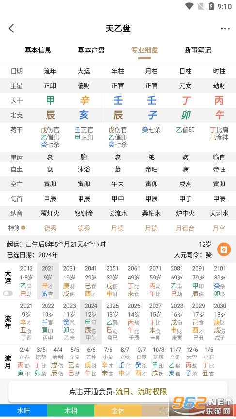 八字排盘,精准解析:天乙盘运用高精度算法,可快速生成个人八字命盘,对年、月、日、时四柱信息进行详细解读,内容覆盖五行强弱、十神关系、大运流年等多个维度。