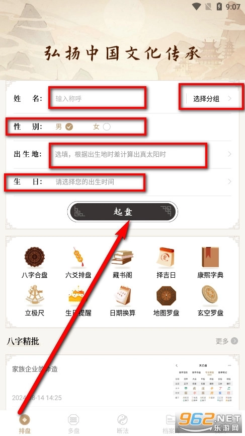 请输入姓名,选择对应的分组,点选性别选项,填写出生地和生日信息。在完成上述所有信息的填写操作后,点击【起盘】按钮。