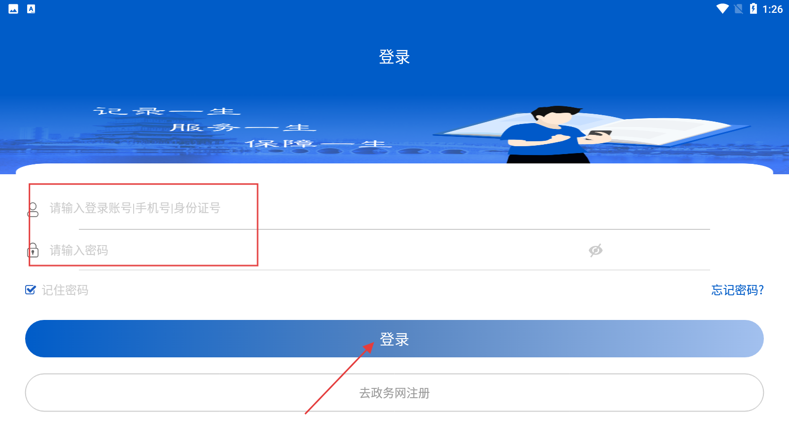 在登录界面,输入账号(可填写手机号或身份证号)与密码后,点击【登录】功能按钮即可完成登录操作。