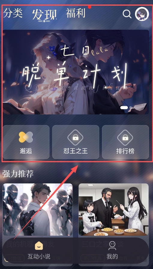 3、想找感兴趣的小说可以浏览分类和发现页面,这里按七日、肥草汁菜等标签推荐内容。