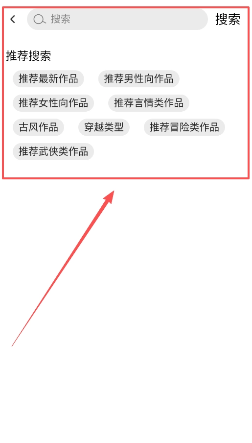 4、要是不清楚该读些什么,不妨试试推荐搜索功能。这里会按照最新作品、男性向、女性向等类别进行划分,同时也有古风、穿越、冒险之类的题材可供挑选。
