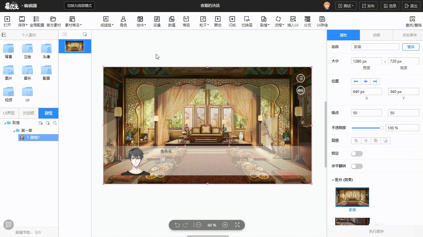 让我们再次借助素材库,在画面里添加一张人物立绘。素材库中的图片支持预览功能。
