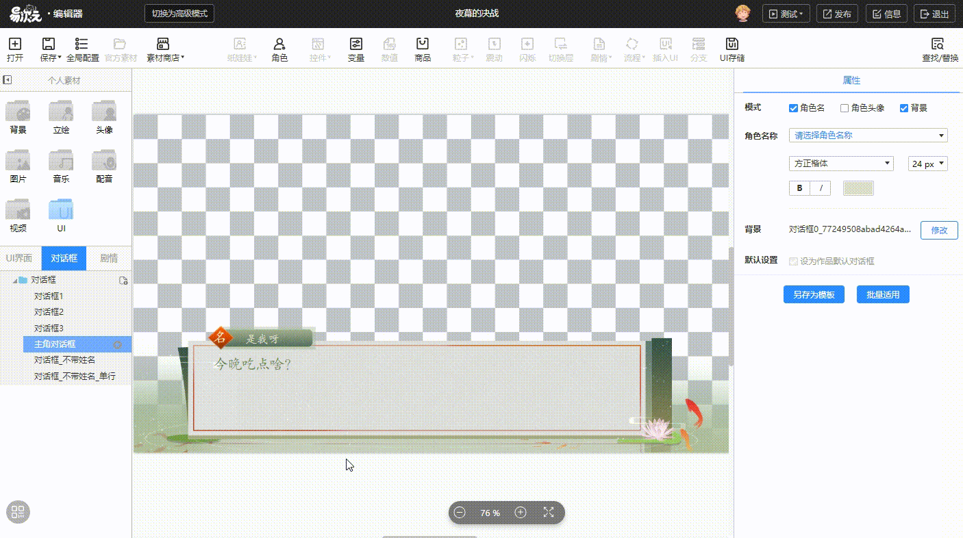 (2)接下来切换至对话框栏,把导入UI中的对话框设置成默认对话框。