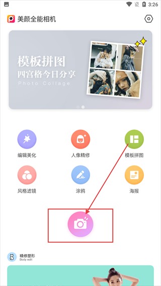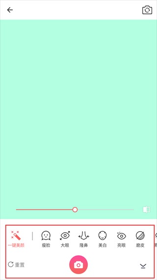 在【美颜全能相机】的界面里,点击中间那个粉色的相机按钮,就能进入到拍照相关的流程中。