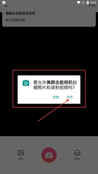 当弹出【是否允许美颜全能相机拍摄照片与录制视频?】的提示框时,点击【允许】按钮以获取相机权限。