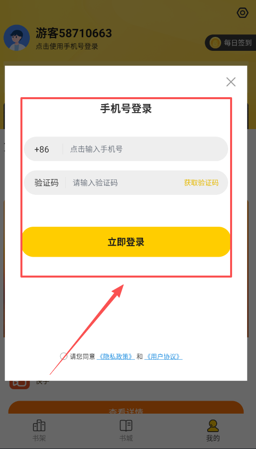 打开App后,先点击底部的“我的”进入个人中心,建议通过“点击使用手机号登录”完成注册,这样阅读记录和书架内容就能实现云端同步了。