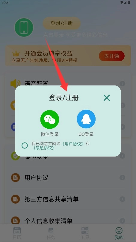 1、进入个人中心后点击登录按钮,勾选用户协议条款,再选择微信快捷登录方式,完成账号验证的相关流程。