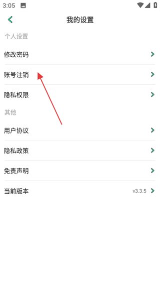 3、在“我的设置”页面中,找到并点击“账号注销”选项,即可进入账号注销提示页面。