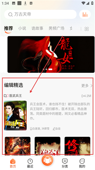 在首页找到【编辑精选】板块,从中选择你感兴趣的目标作品,点击即可进入作品详情页面,在那里你可以查看作品内容,为收听做好准备。