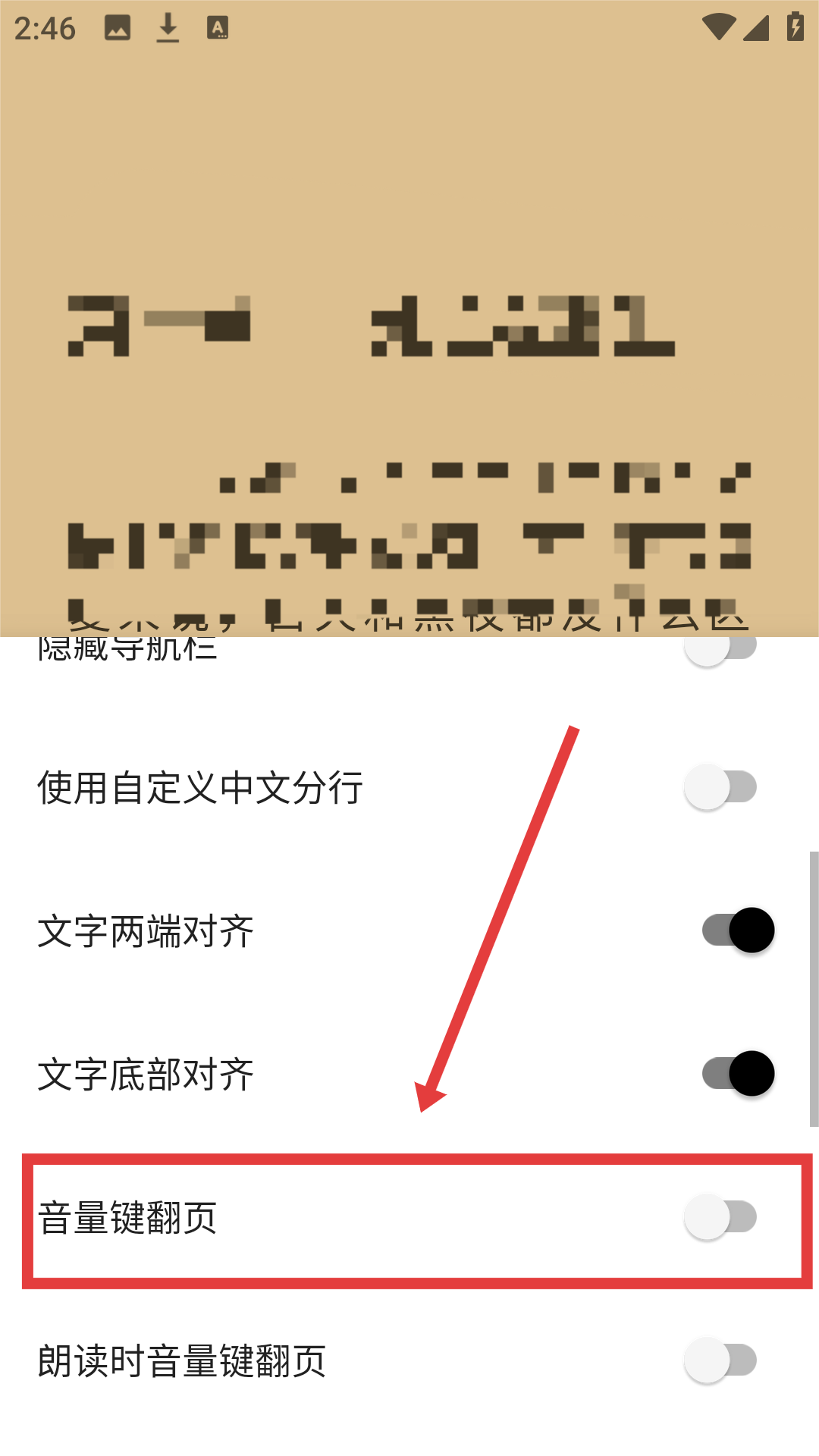 4、开启【音量键翻页】功能后,就可以通过音量键来实现翻页,让阅读变得更加方便。