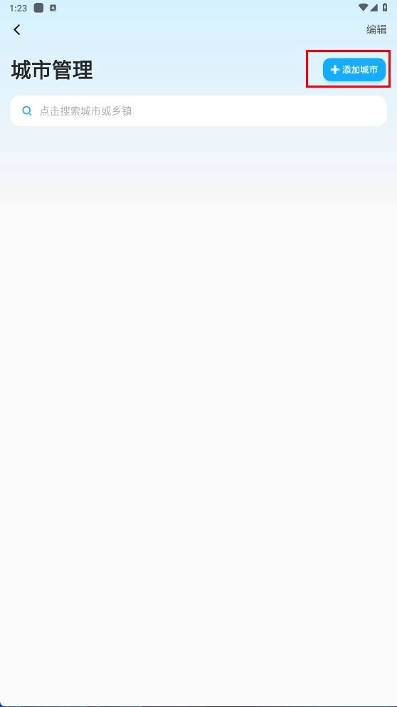 在城市管理页面,点击【+添加城市】按钮,即可搜索并添加想要的城市,对关注的城市列表进行管理。
