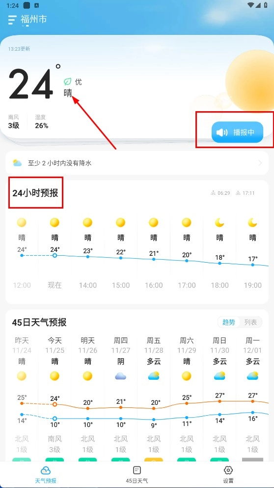 进入城市天气页面后,你可以查看【24小时预报】和45天预报,还能点击【播报】按钮收听天气语音播报。