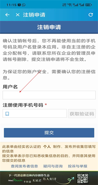 4、进入注销申请页面后,会看到需要填写的信息项,接下来要在用户名等输入框中填入相应信息,然后提交注销申请。