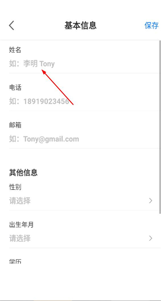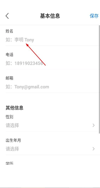 4、进入基本信息页面,看到姓名电话等输入项,准备在对应输入框填写个人信息后进行保存。