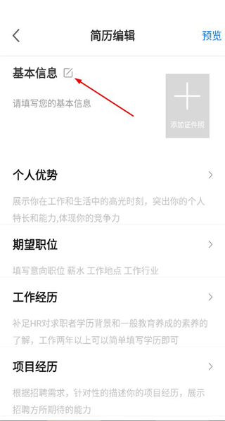 3、进入简历编辑页面,看到基本信息等板块,找到基本信息选项,点击该选项进入基本信息填写页面。