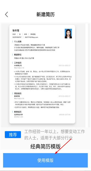 2、进入新建简历页面,看到经典简历模板,找到使用模板按钮,点击该按钮进入简历编辑页面。