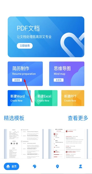 1、打开软件首页,看到PDF处理等功能入口,找到简历制作选项,点击该选项进入新建简历页面。