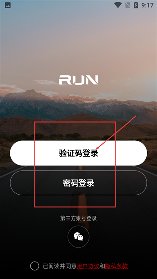2、进入【RUN】的登录界面,可选【验证码登录】-【密码登录】等方式,需先勾选协议后再执行登录操作。