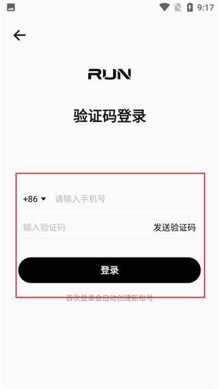 3、在【RUN】的【验证码登录】页面,选【+86】区号,输入手机号后点【发送验证码】,填码后点击【登录】完成操作。