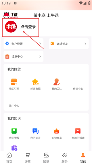 2、进入【牛选】的个人中心页面,点击【点击登录】的区域来启动登录流程,此页面集成了账户设置、订单中心等功能模块。