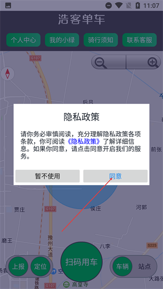 1、仔细阅读【隐私政策】条款后,点击【同意】按钮,就能开启浩客单车的服务,进入主界面使用各项相关功能。