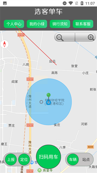 在主界面能够查看地图以及车辆分布情况,点击【个人中心】按钮即可进入登录页面,登录后就可以对个人骑行相关信息进行管理。