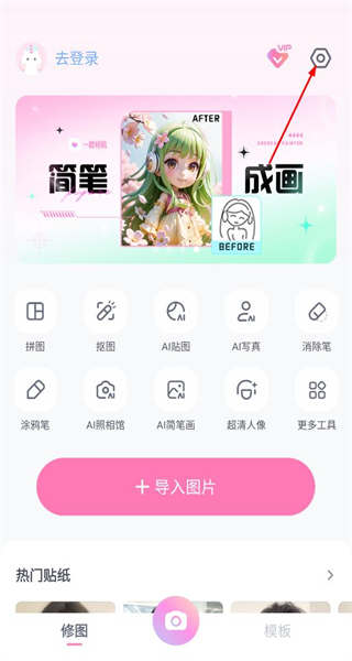 1、打开一甜相机的主界面后,能看到各种修图功能选项,接着找到设置按钮,点击这个按钮就能进入设置页面。