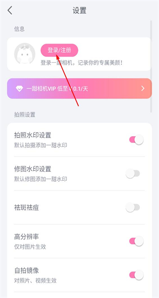 2、进入设置界面后,能看到登录注册入口以及各类功能开关,点击该登录注册入口即可进入相应页面。