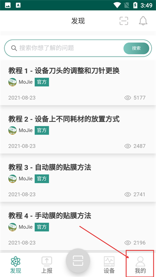 2、进入【发现】页面,可查看设备操作相关教程内容,点击底部导航栏的【我的】按钮,进入个人功能操作页面。