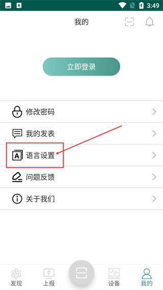 3、在【我的】页面,可看到【立即登录】等功能选项,点击【语言设置】选项,进入应用的语言选择界面。