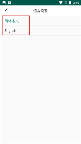 4、进入【语言设置】页面,可在【简体中文】与【English】两个选项中,选择应用的显示语言,完成语言配置操作。