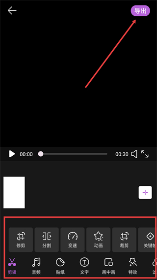 在剪辑界面中,你可以运用【修剪】【分割】等功能对视频进行编辑,操作完成后,点击【导出】按钮就能保存制作好的成品视频。