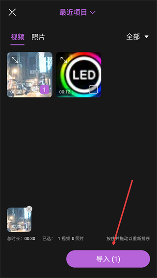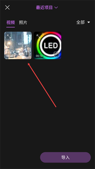 2、在【最近项目】的视频列表里,选中想要导入剪辑流程的目标视频素材。