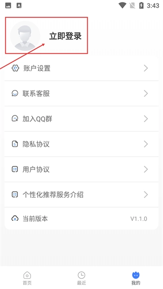 2、进入【我的】页面后,点击【立即登录】按钮进入登录界面,还能查看【账户设置】【联系客服】等功能选项。
