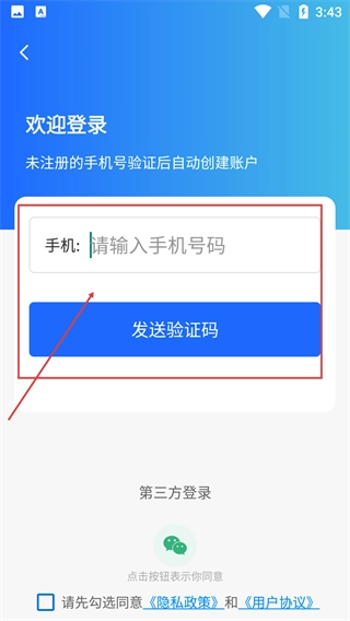 3、在登录页面,填写【请输入手机号码】,点击【发送验证码】获取验证信息,也能选择第三方登录方式。
