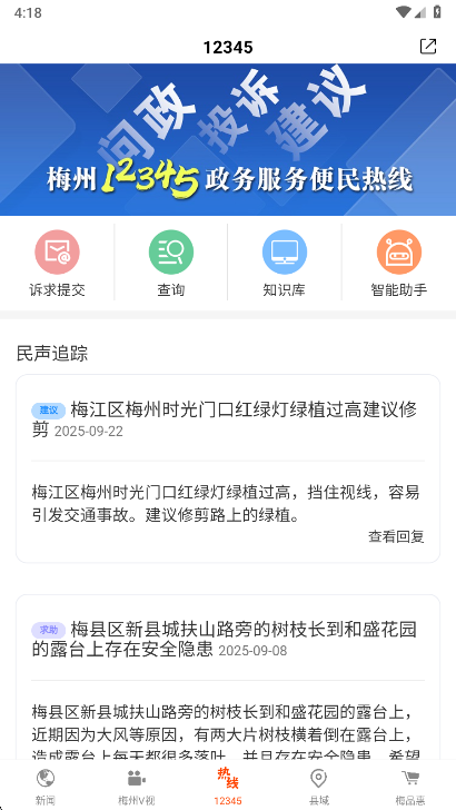3、同时也为梅州开通了12345热线电话,市民可通过该热线提交诉求