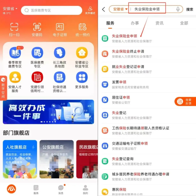 打开“皖事通”完成注册登录后,在首页搜索栏输入“失业保险金申领”,找到对应服务入口并点击进入。