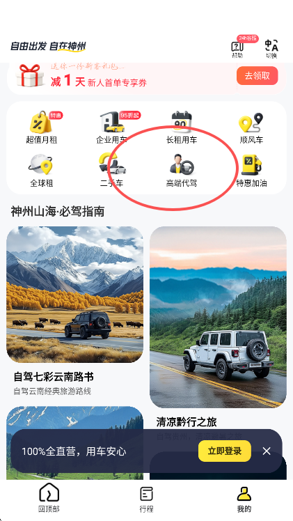 1、打开神州租车应用,在主界面挑选租车的车型类别,像经济型、商务型这类都可以选择。