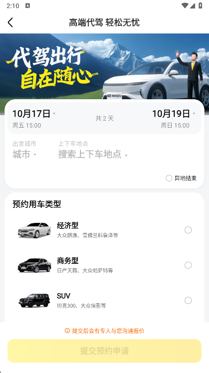 2、进入后选择好出发城市、上下车地点以及预约用车类型,然后点击提交预约申请即可。